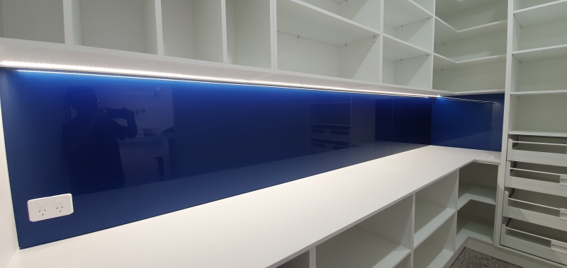 Yeehaa is this amazing blue metallic splashback is their pantry. |